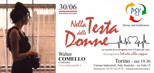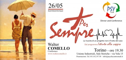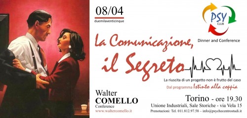 Una cena elegante nelle sale storiche dell’Unione Industriali a Torino è occasione per affrontare, in una coinvolgente conferenza, il complesso tema delle relazioni di coppia. Un’idea nuova di CLUB senza necessità di iscrizioni o tesseramenti, semplicemente un tempo e un luogo, per persone che hanno il piacere di ritrovarsi e condividere appuntamenti di cultura utile e psico-soluzioni, accompagnati da Walter Comello, psicologo psicoterapeuta.